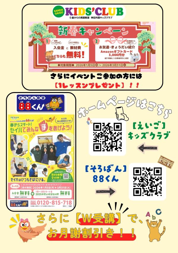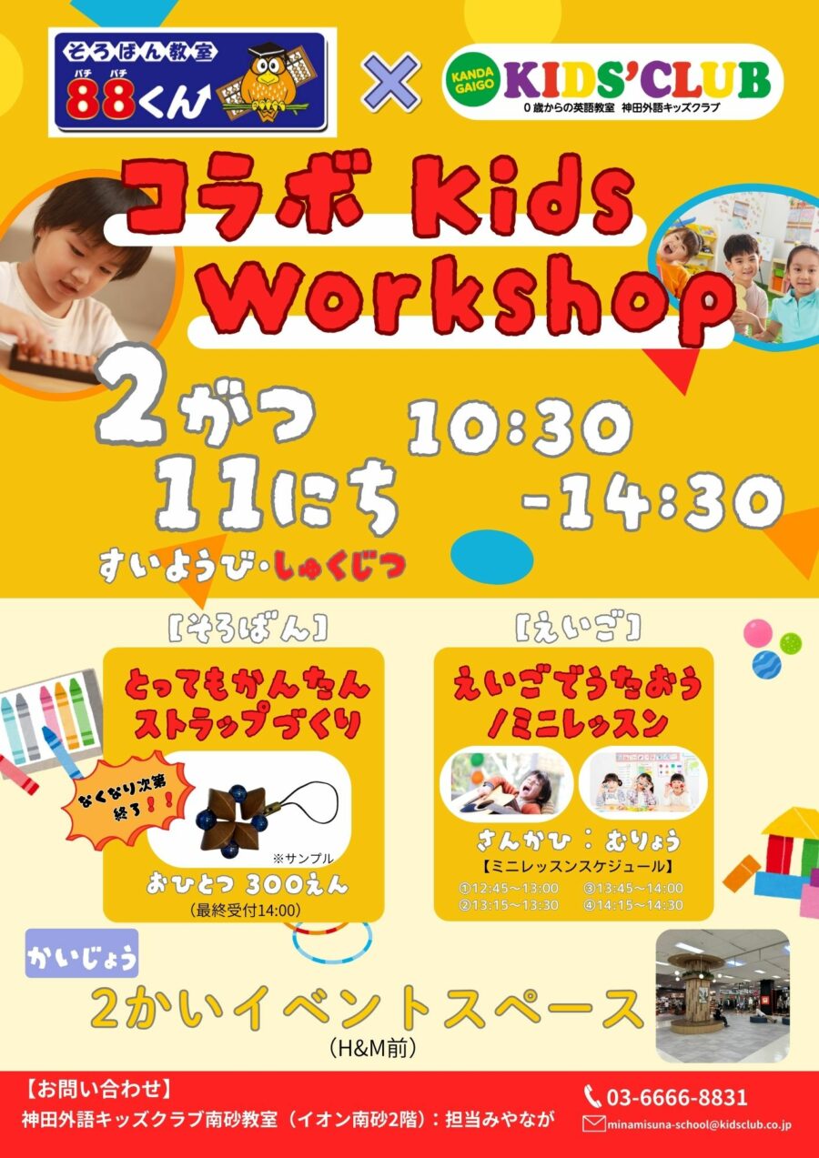 そろばん教室88くんAS南砂教室と神田外語キッズクラブ南砂教室が共催で開催するイベントです。「そろばん」も「えいご」も楽しいイベントです。
