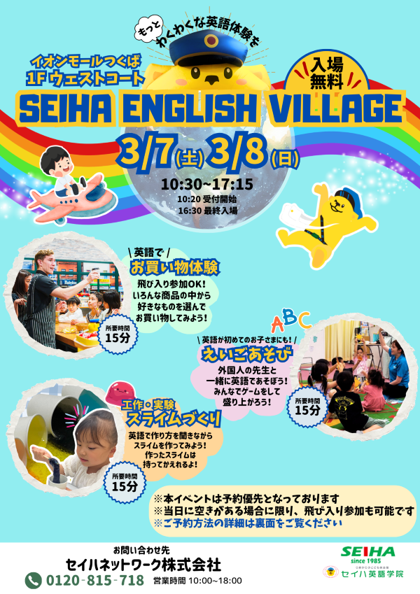 88くん姉妹教室の【セイハ英語学院イオンモールつくば教室】による3/7(土)3/8(日)〈SEIHAENGLISHVILLAGE〉のお知らせです