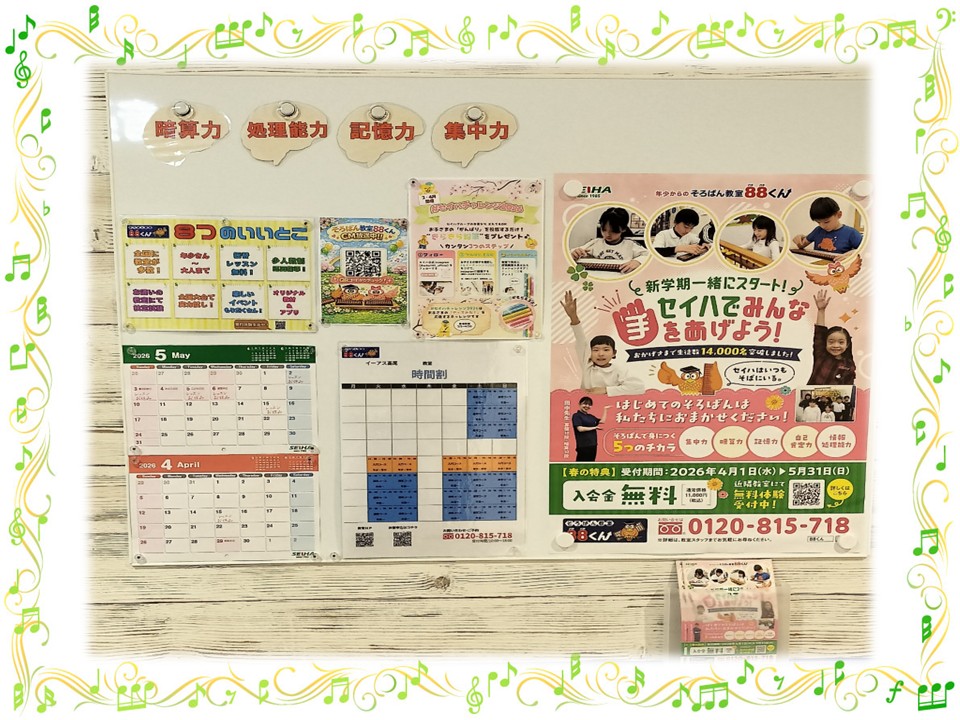 そろばんは、計算力を高め集中力、忍耐力を養います。級が上がる、計算が速くなる、暗算が出来るようになる。努力したことが目に見えてわかるので、頑張ればこんなに出来たと実感できる習い事です。是非、一度体験にいらっしゃいませんか。