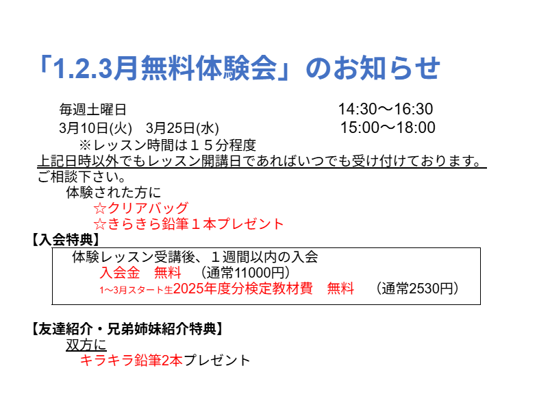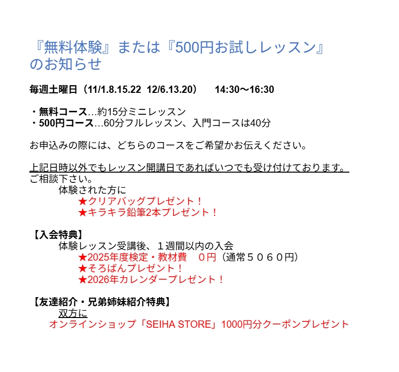 | 教室開校日 | 月 ・ 火 ・ 水 ・ 金 ・ 土 ・ 日 |