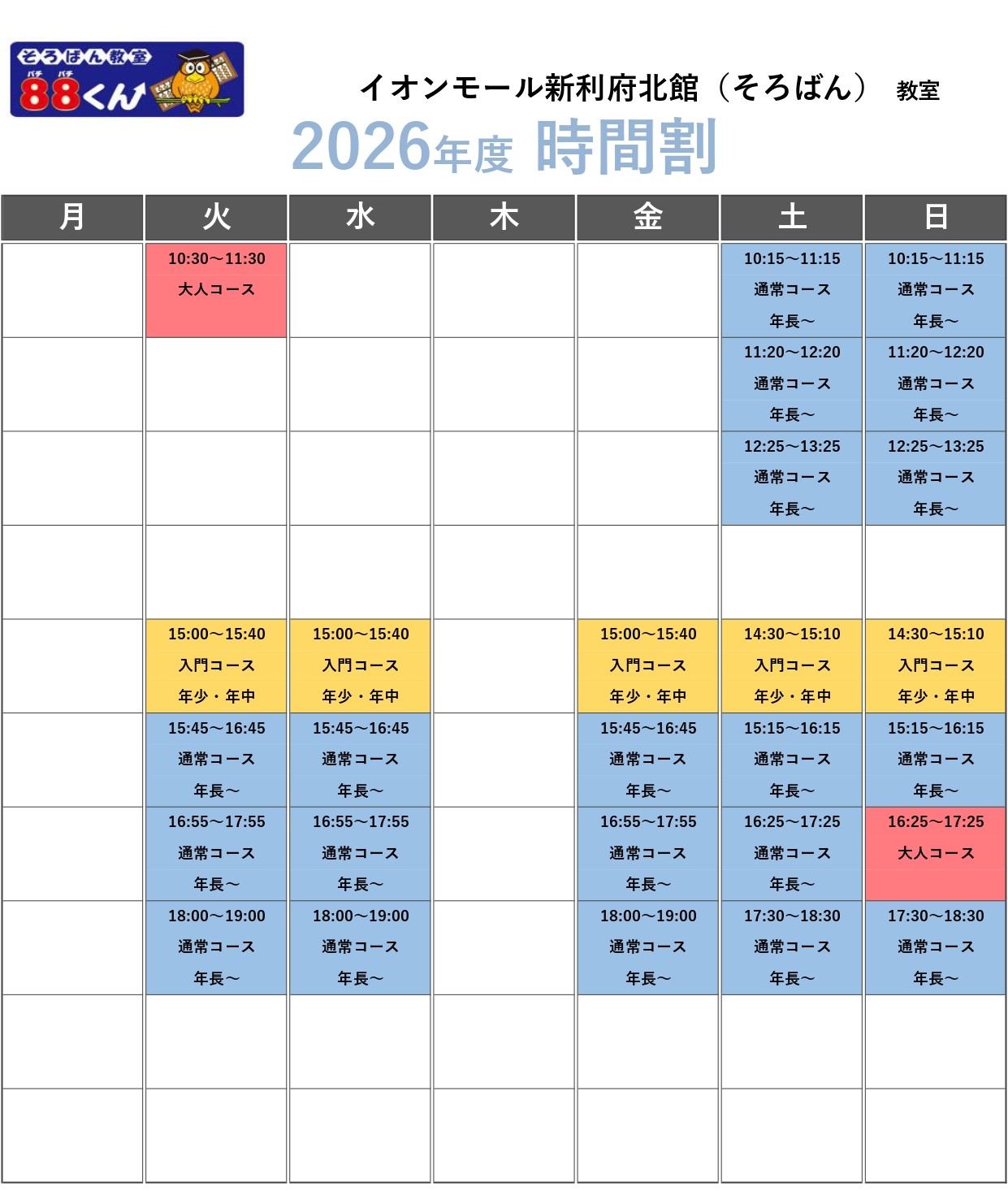 | 教室開校日 | 火 ・ 水 ・ 金 ・ 土 ・ 日 |