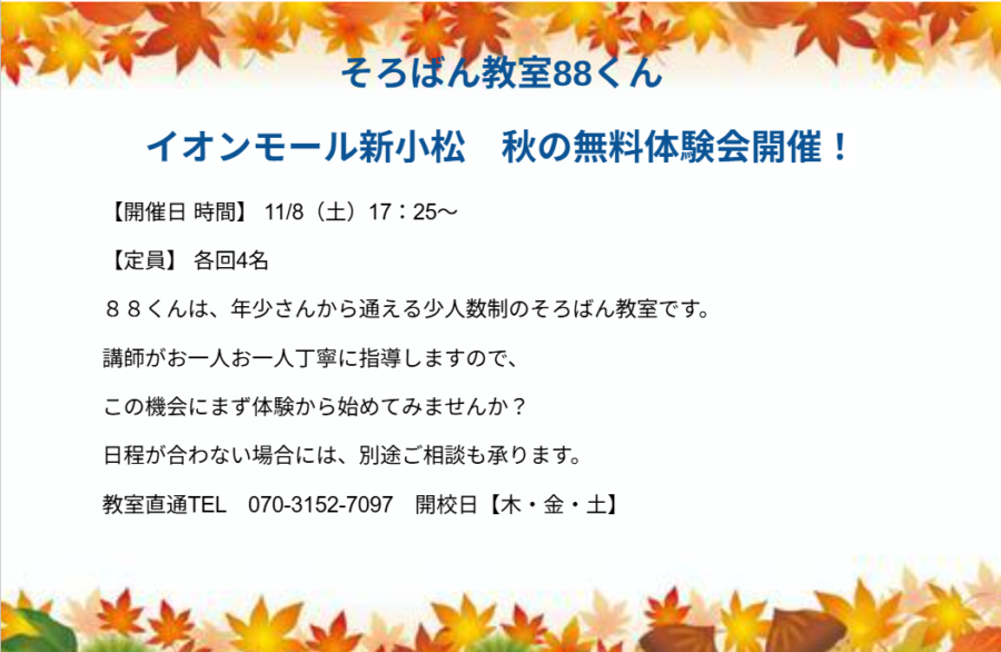 | 教室開校日 | 水 ・ 木 ・ 金 ・ 土 |