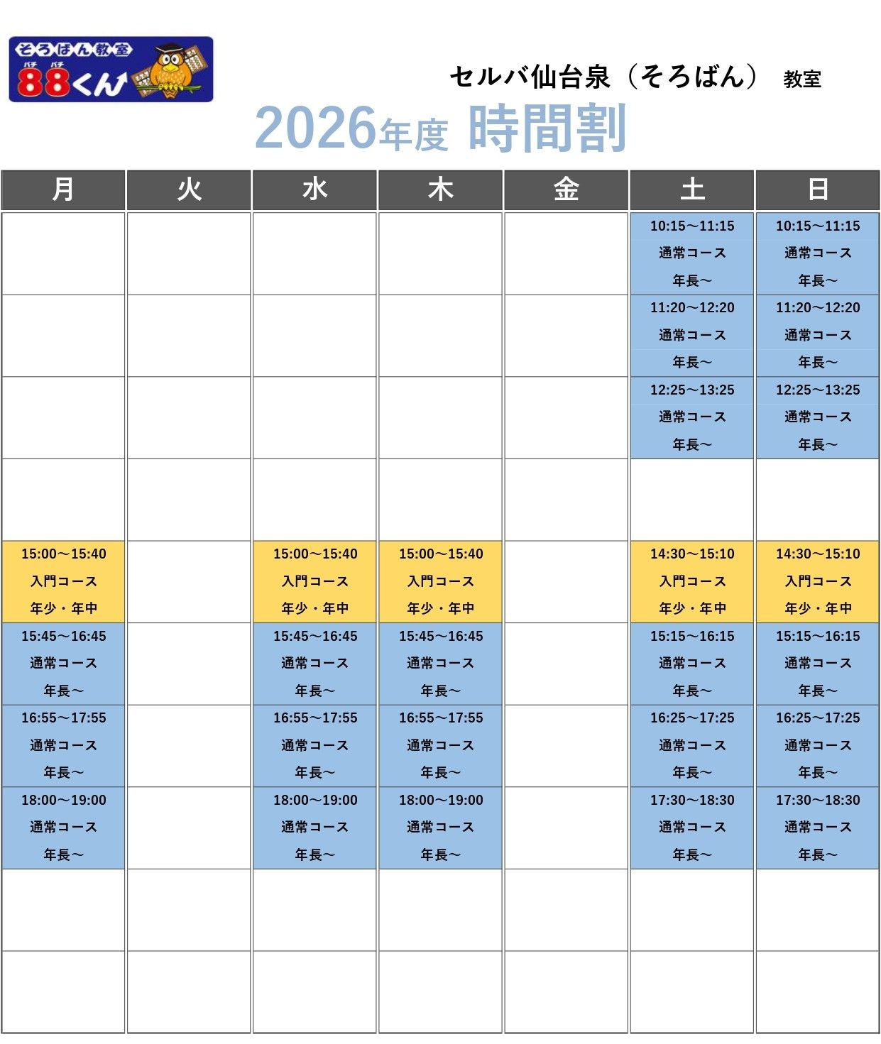 | 教室開校日 | 月 ・ 水 ・ 木 ・ 土 ・ 日 |